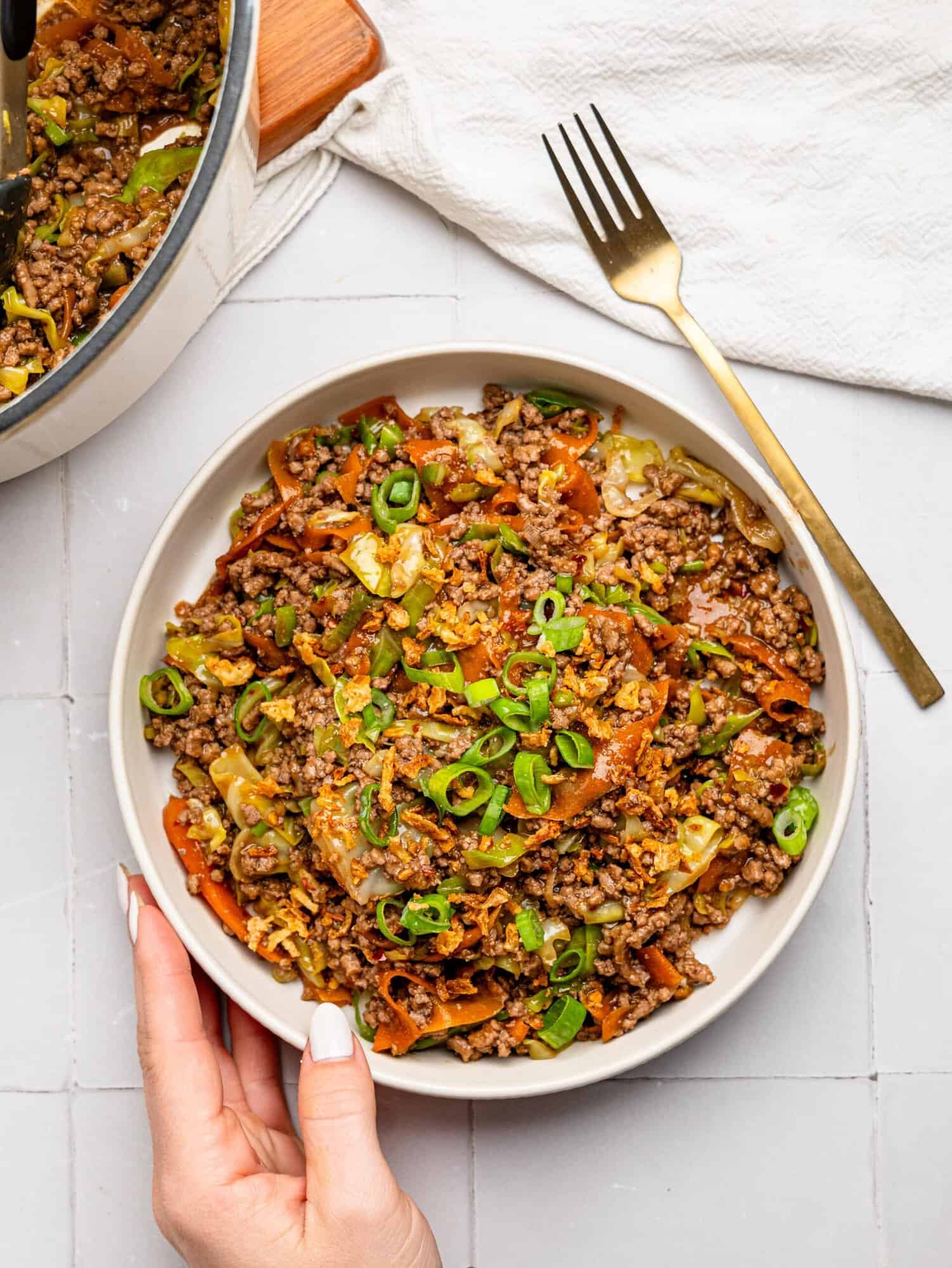 It’s also incredibly versatile. The base recipe uses extra lean beef mince for a high-protein meal, but you can easily swap in chicken, turkey, tofu, or prawns to suit your taste or dietary needs. Plus, it’s a great fridge-clearer – almost any crunchy veg works here, so you can make it slightly different every time while still getting that spring-roll-inspired flavor profile.
